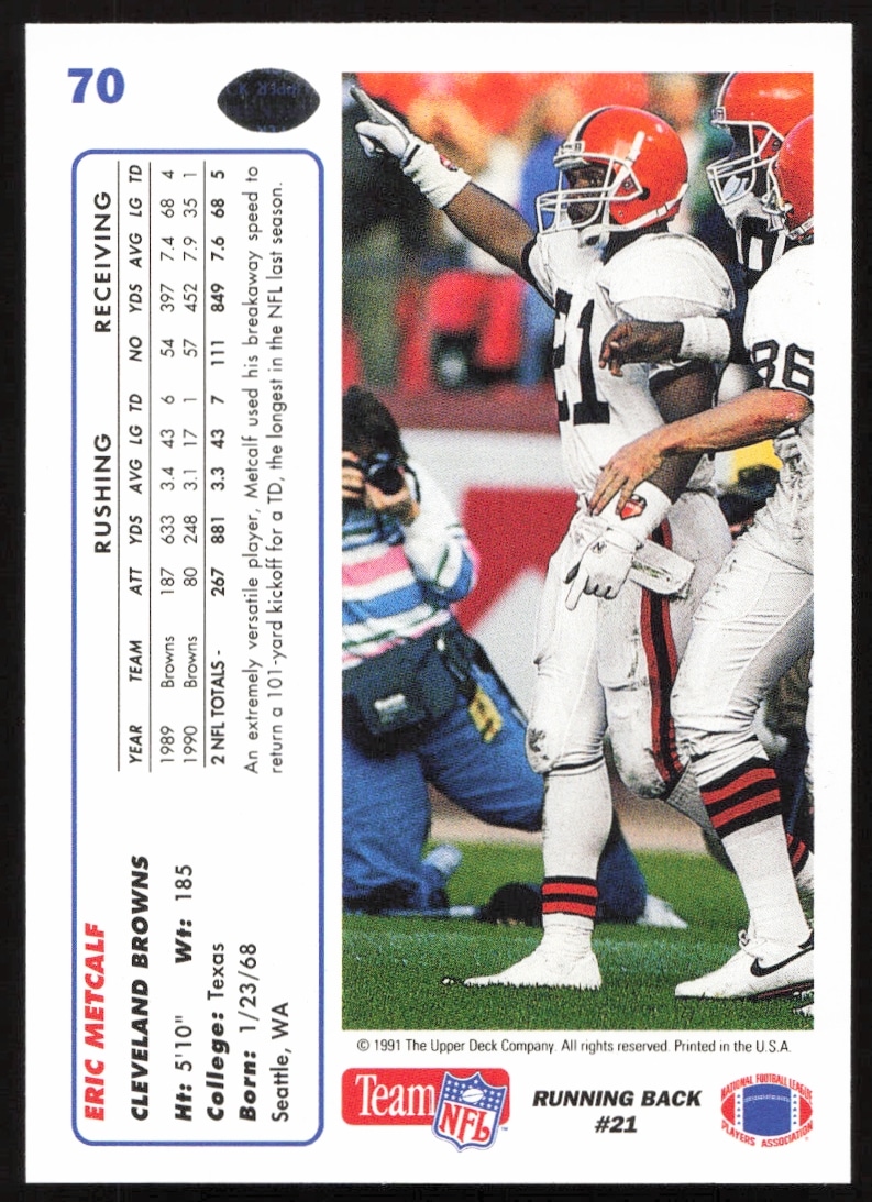 This Football card, from 1991 is part of the Upper Deck card set. Eric Metcalf is featured and has a card number of 70.
