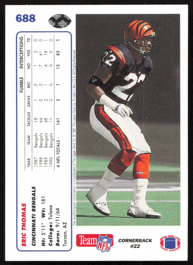 This Football card, from 1991 is part of the Upper Deck card set. Eric Thomas is featured and has a card number of 688.