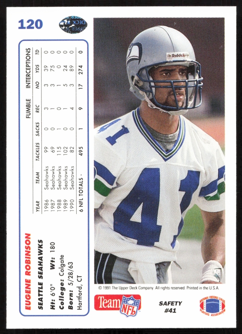 This Football card, from 1991 is part of the Upper Deck card set. Eugene Robinson is featured and has a card number of 120.
