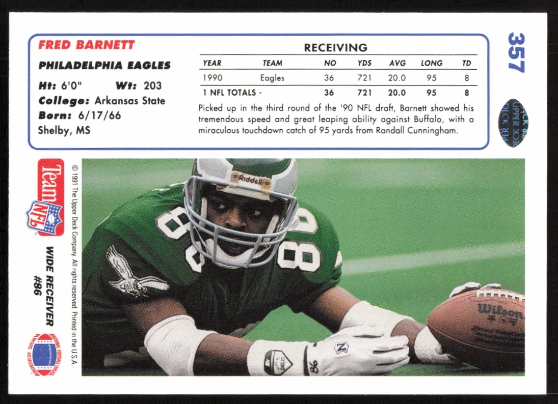 This Football card, from 1991 is part of the Upper Deck card set. Fred Barnett is featured and has a card number of 357.