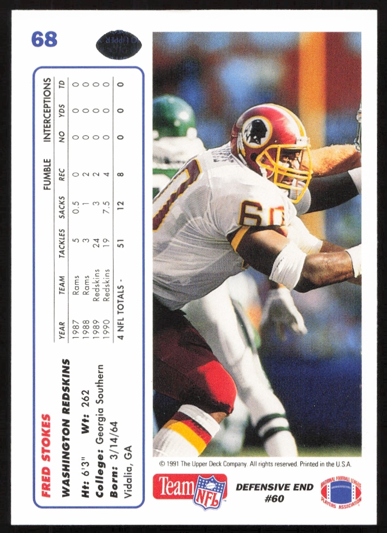 This Football card, from 1991 is part of the Upper Deck card set. Fred Stokes is featured and has a card number of 68.
