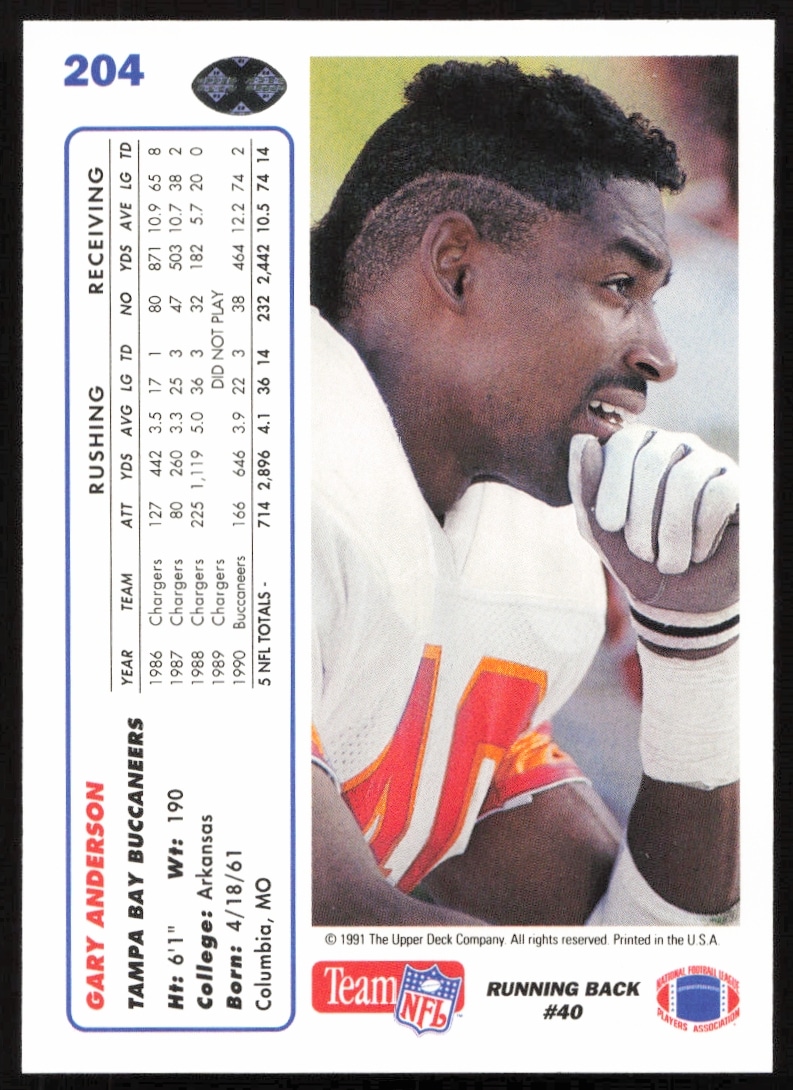 This Football card, from 1991 is part of the Upper Deck card set. Gary Anderson is featured and has a card number of 204.