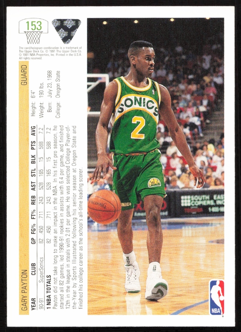 This Basketball card, from 1991-92 is part of the Upper Deck card set. Gary Payton is featured and has a card number of 153.