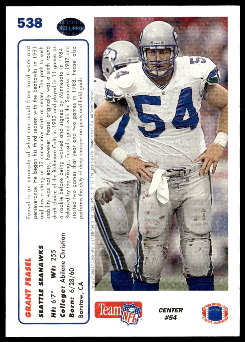 This Football card, from 1991 is part of the Upper Deck card set. Grant Feasel is featured and has a card number of 538.