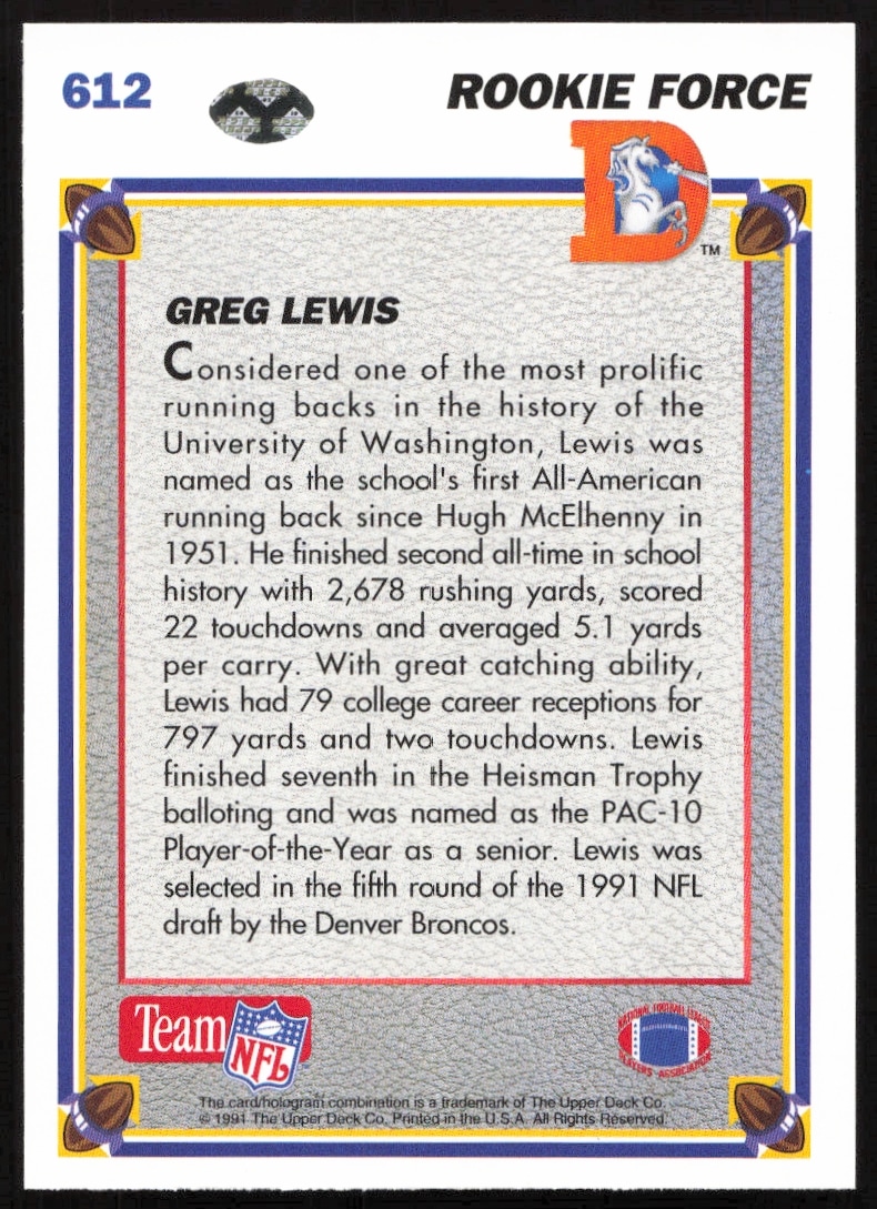This Football card, from 1991 is part of the Upper Deck card set. Greg Lewis is featured and has a card number of 612.