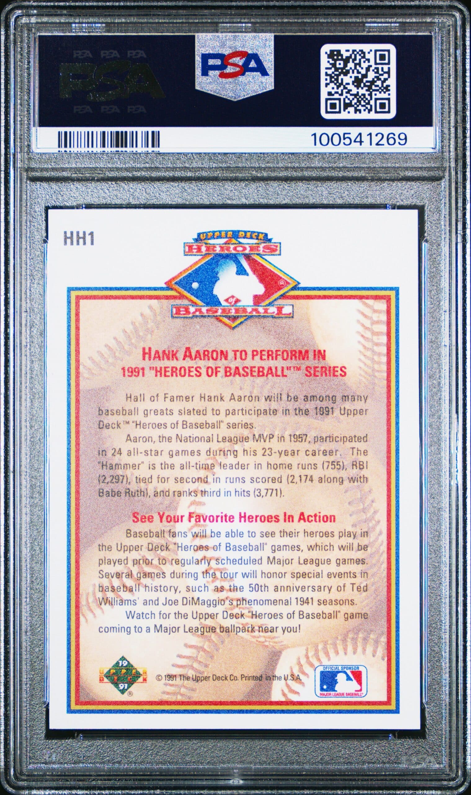 This Baseball card, from 1991 is part of the Upper Deck  card set. Hank Aaron is featured and has a card number of HH1. It is graded by PSA and has a numeric grade of 9.