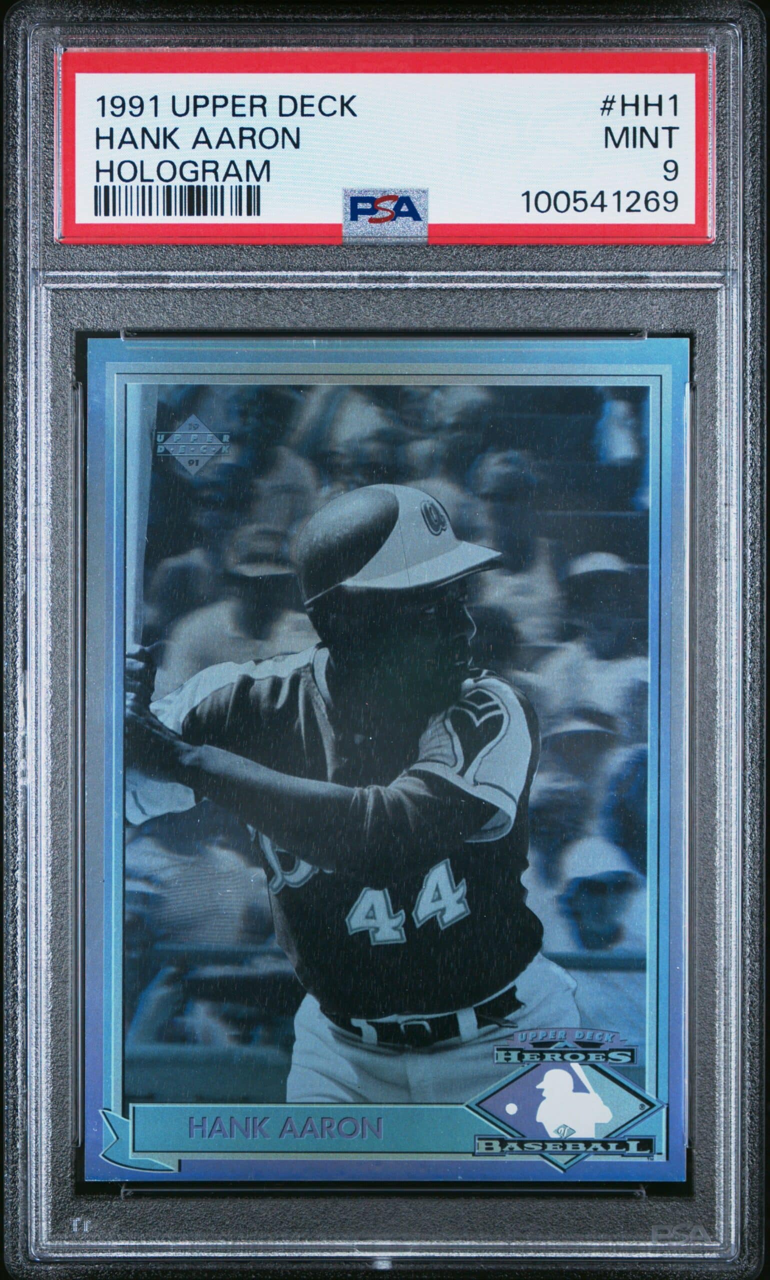 Get the rare 1991 Upper Deck Hank Aaron Hologram #HH1 in PSA 9 condition—an essential collectible for any baseball fan!