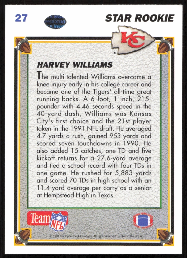 This Football card, from 1991 is part of the Upper Deck card set. Harvey Williams is featured and has a card number of 27.