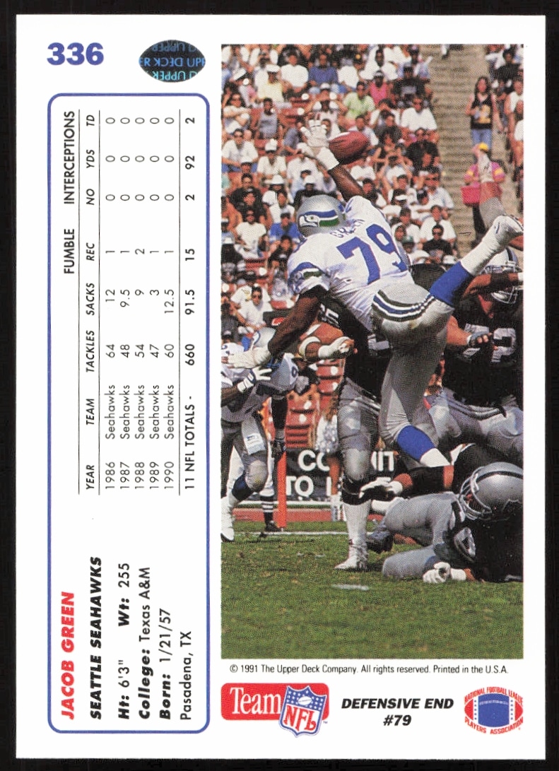 This Football card, from 1991 is part of the Upper Deck card set. Jacob Green is featured and has a card number of 336.