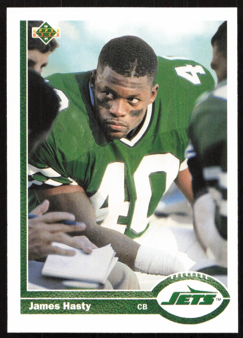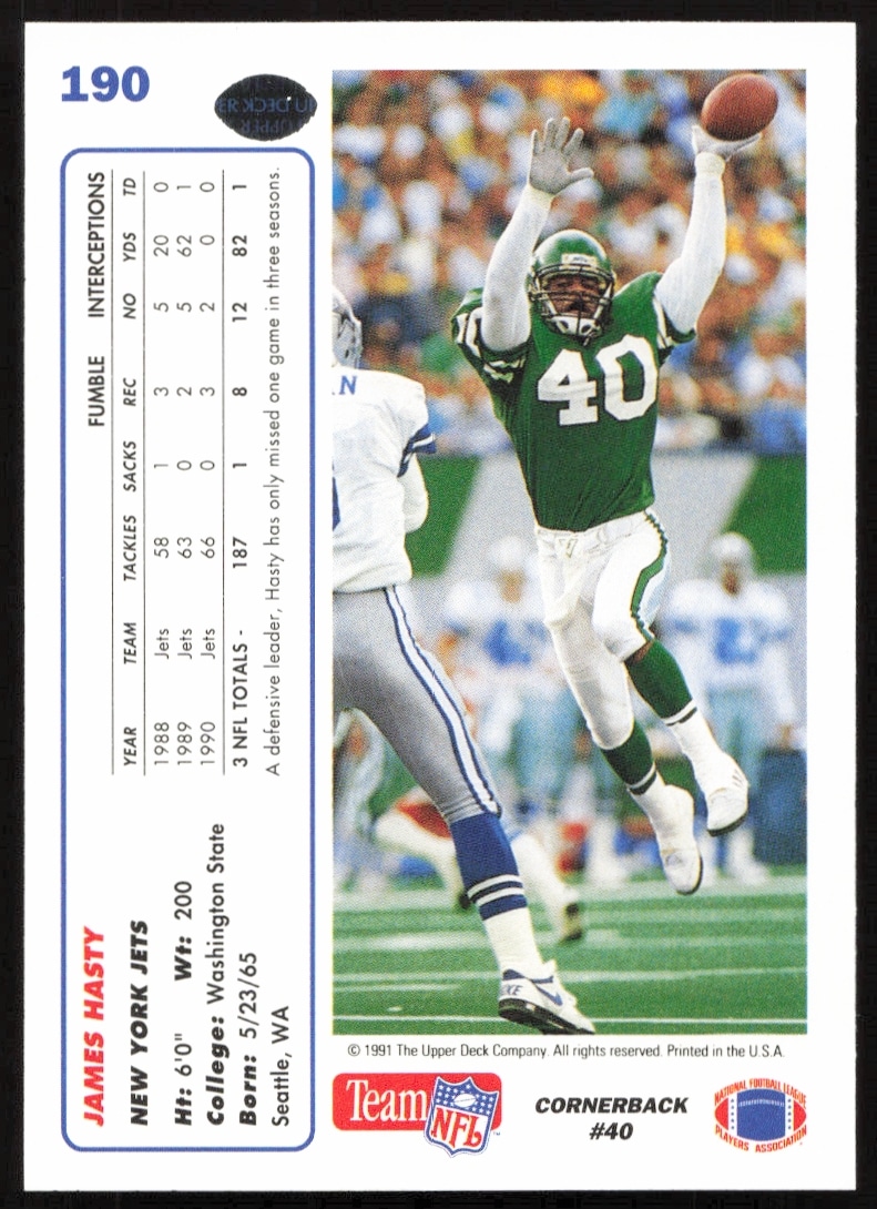This Football card, from 1991 is part of the Upper Deck card set. James Hasty is featured and has a card number of 190.