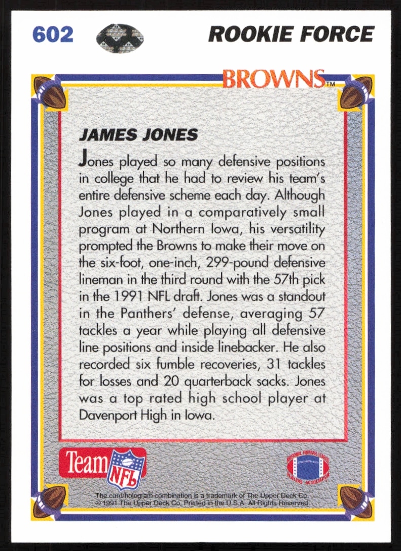 This Football card, from 1991 is part of the Upper Deck card set. James Jones is featured and has a card number of 602.