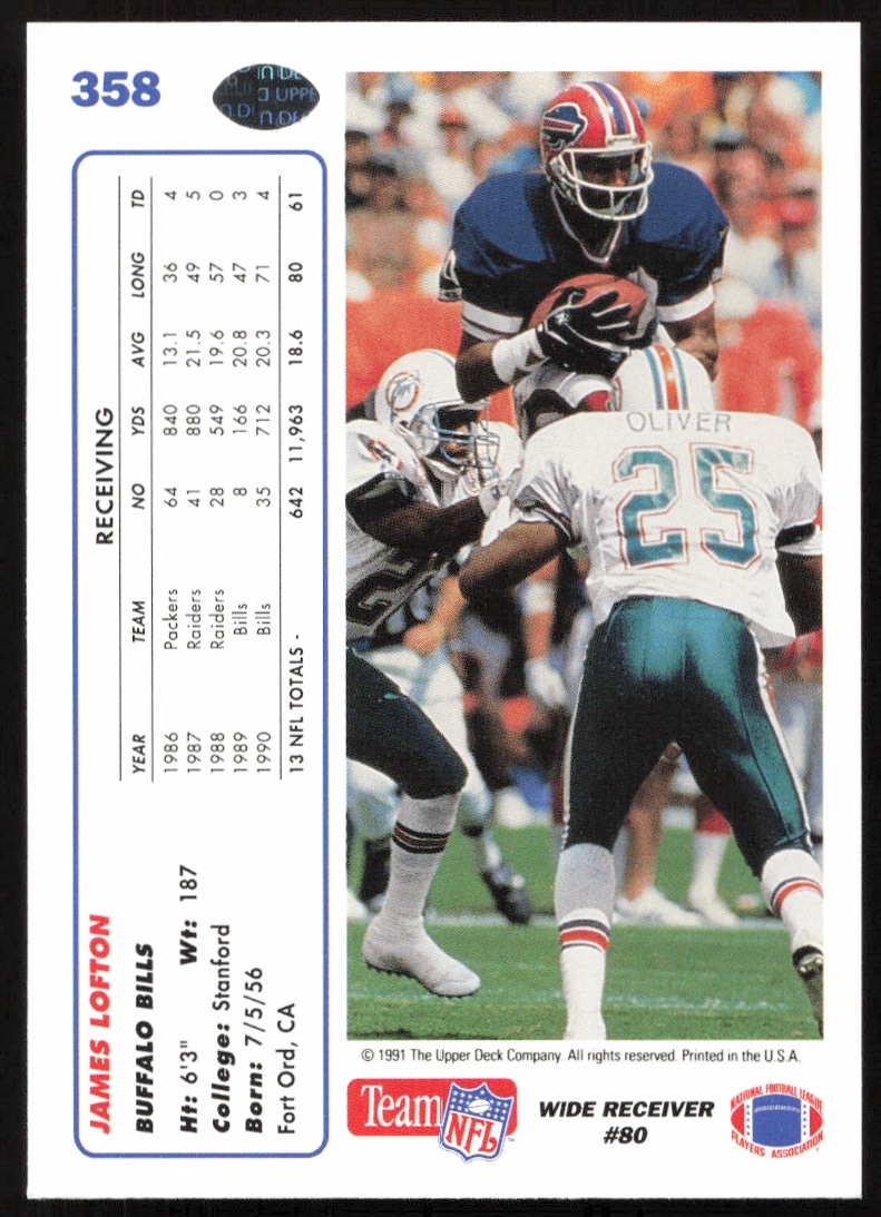 This Football card, from 1991 is part of the Upper Deck card set. James Lofton is featured and has a card number of 358.