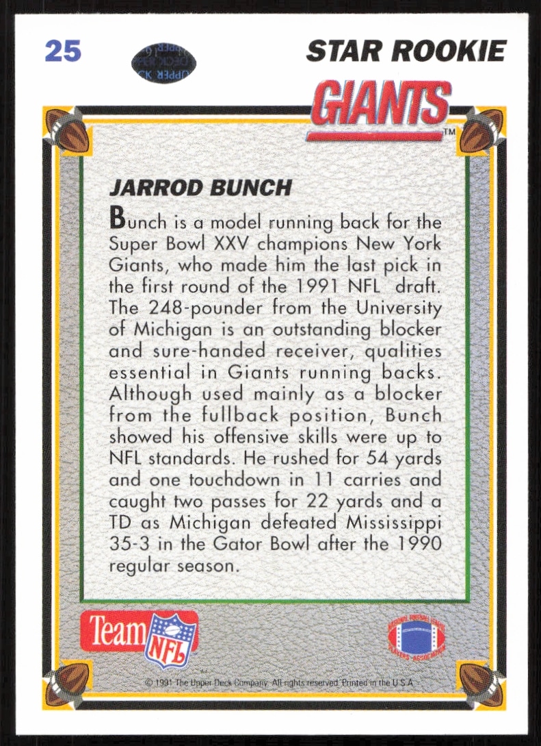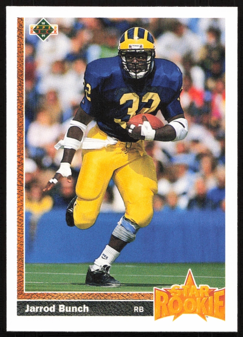 This Football card, from 1991 is part of the Upper Deck card set. Jarrod Bunch is featured and has a card number of 25.