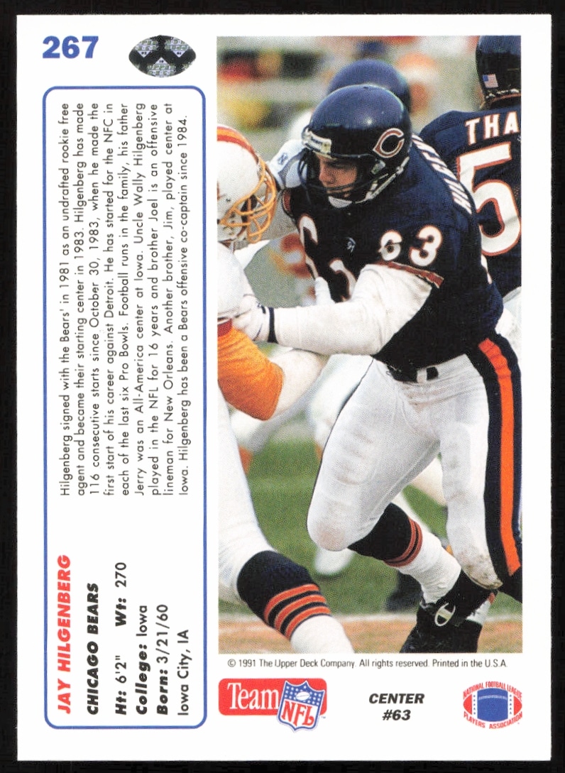 This Football card, from 1991 is part of the Upper Deck card set. Jay Hilgenberg is featured and has a card number of 267.