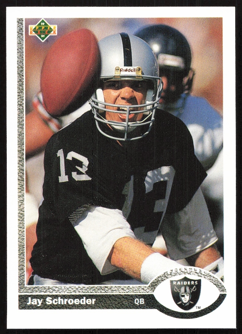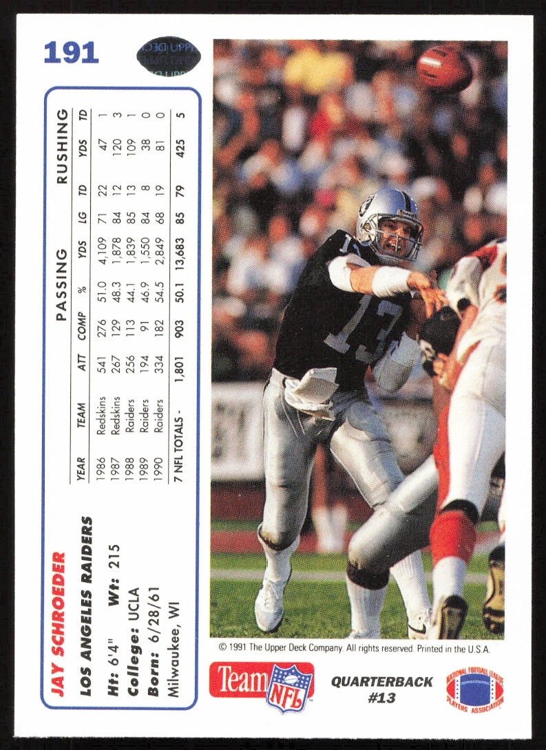 This Football card, from 1991 is part of the Upper Deck card set. Jay Schroeder is featured and has a card number of 191.