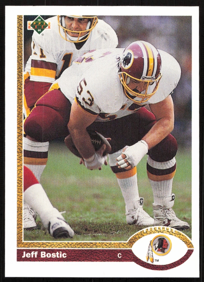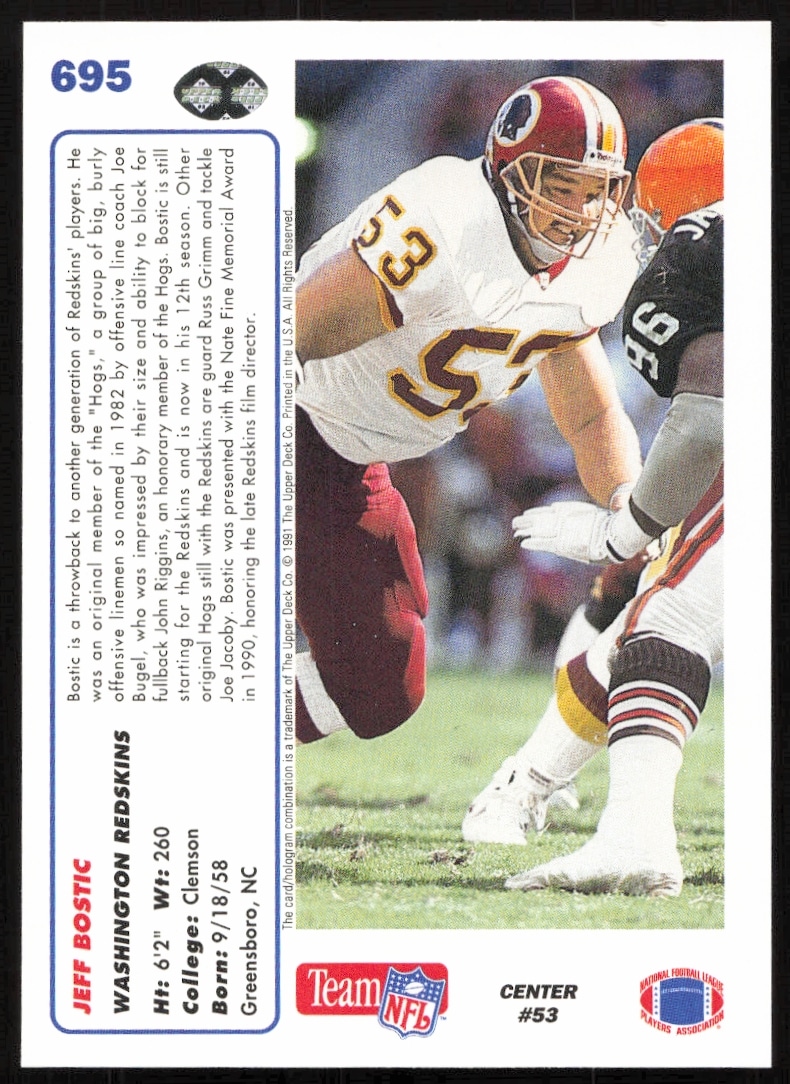 This Football card, from 1991 is part of the Upper Deck card set. Jeff Bostic is featured and has a card number of 695.