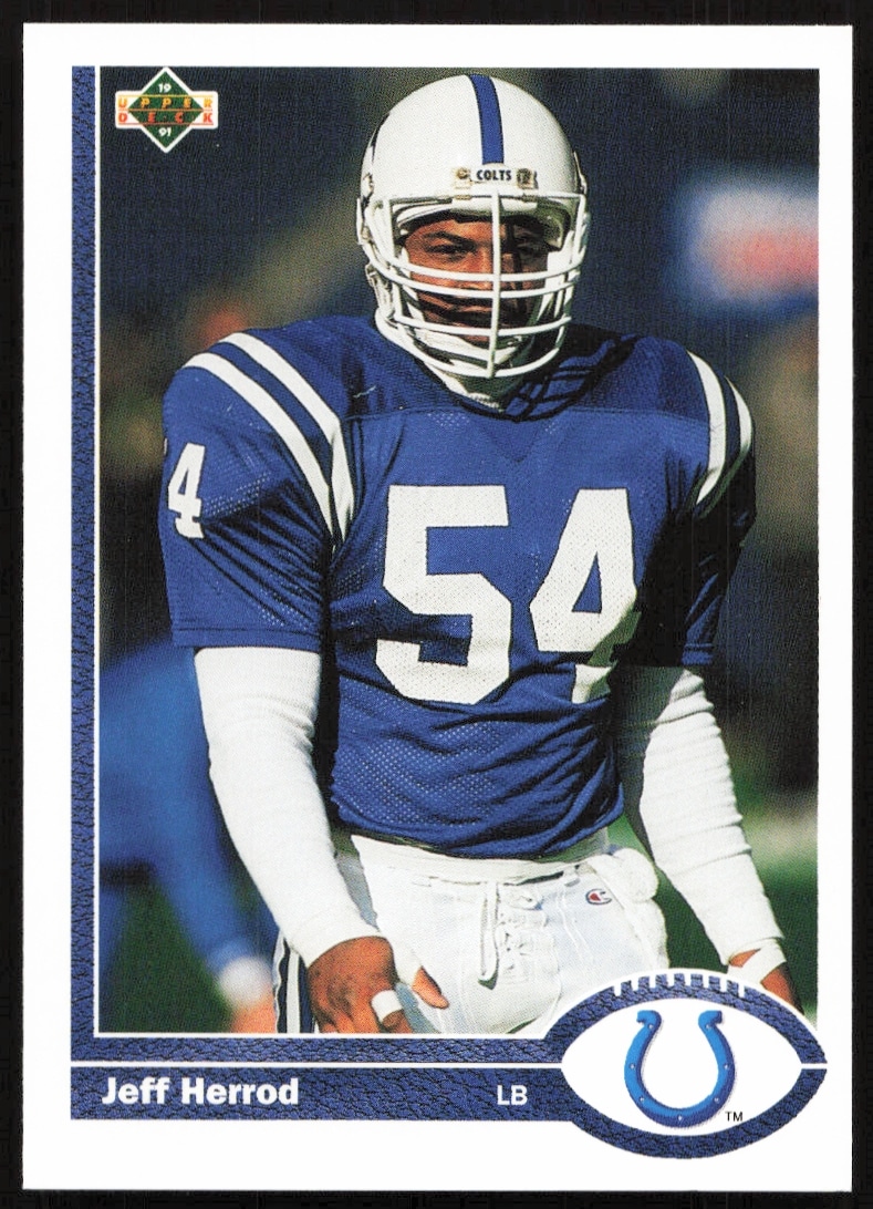 This Football card, from 1991 is part of the Upper Deck card set. Jeff Herrod is featured and has a card number of 55.