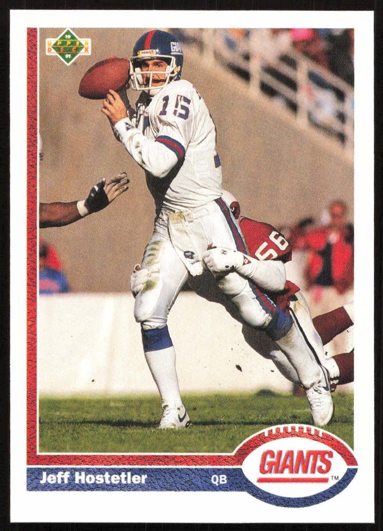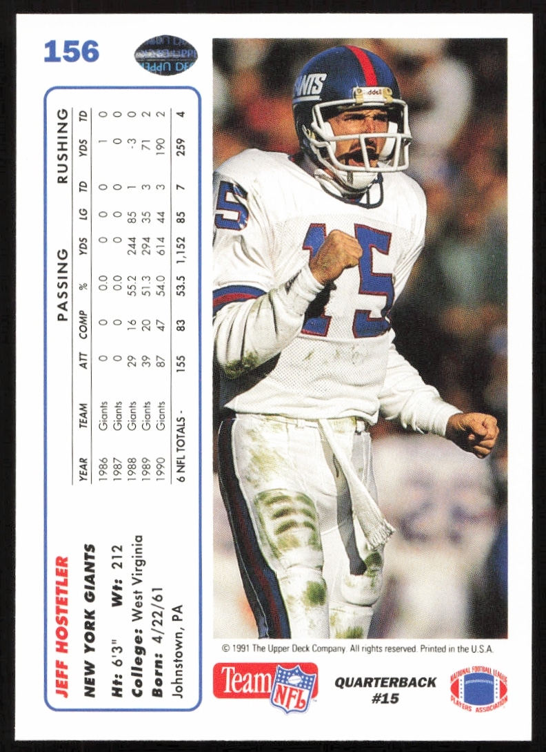 This Football card, from 1991 is part of the Upper Deck card set. Jeff Hostetler is featured and has a card number of 156.