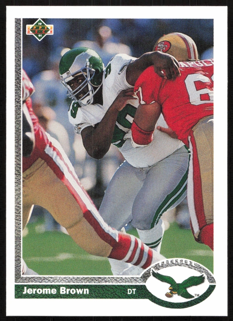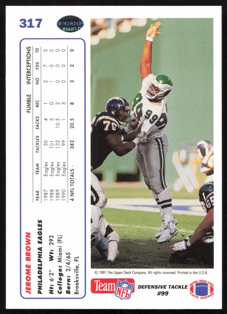 This Football card, from 1991 is part of the Upper Deck card set. Jerome Brown is featured and has a card number of 317.