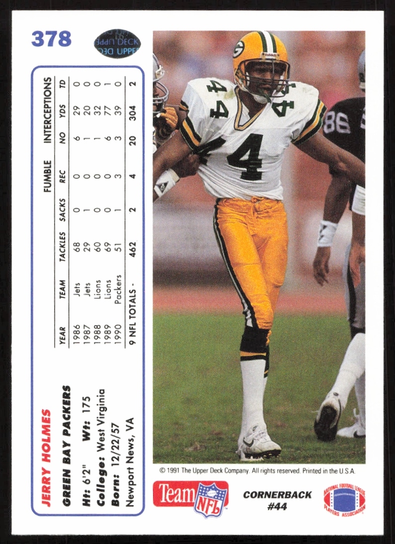 This Football card, from 1991 is part of the Upper Deck card set. Jerry Holmes is featured and has a card number of 378.
