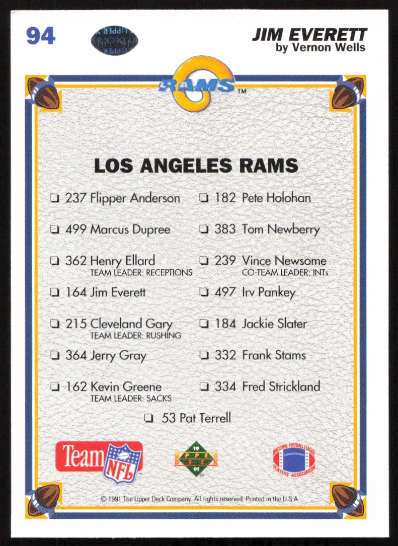 This Football card, from 1991 is part of the Upper Deck card set. Jim Everett is featured and has a card number of 94.