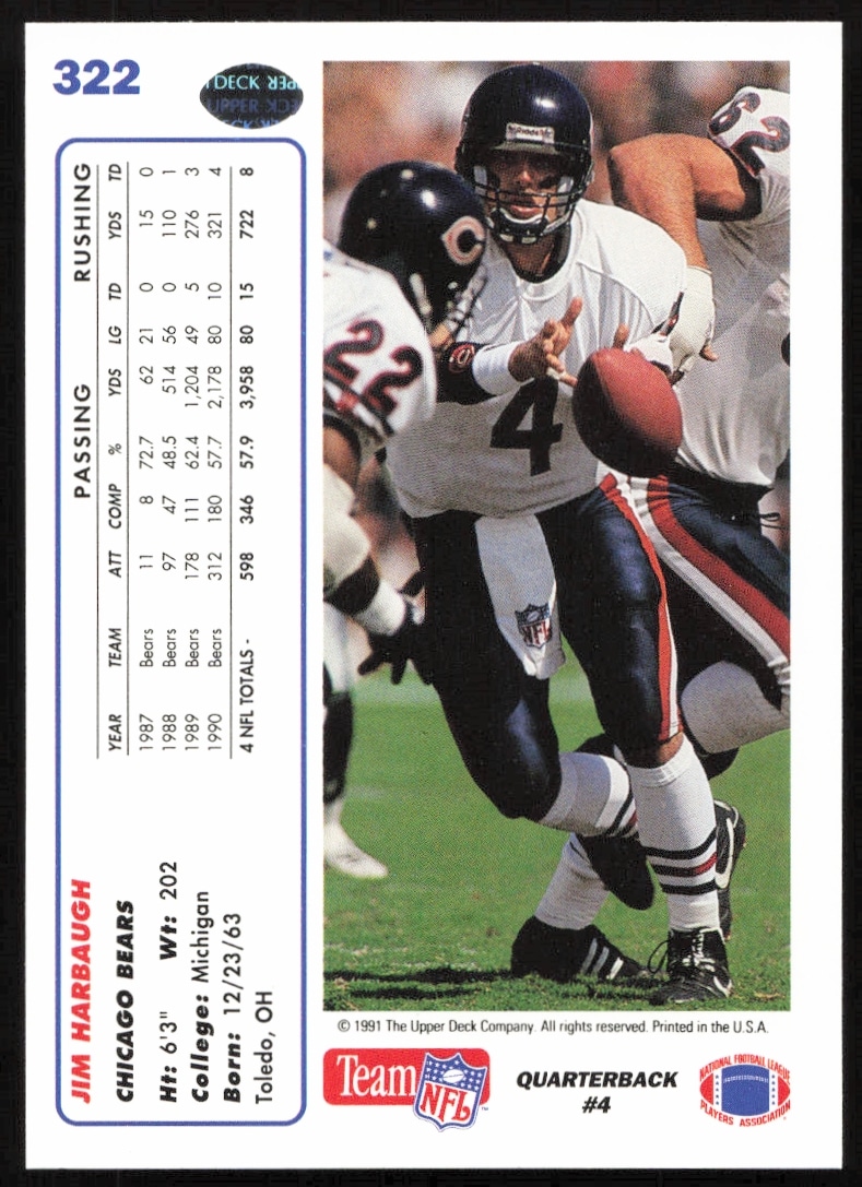 This Football card, from 1991 is part of the Upper Deck card set. Jim Harbaugh is featured and has a card number of 322.