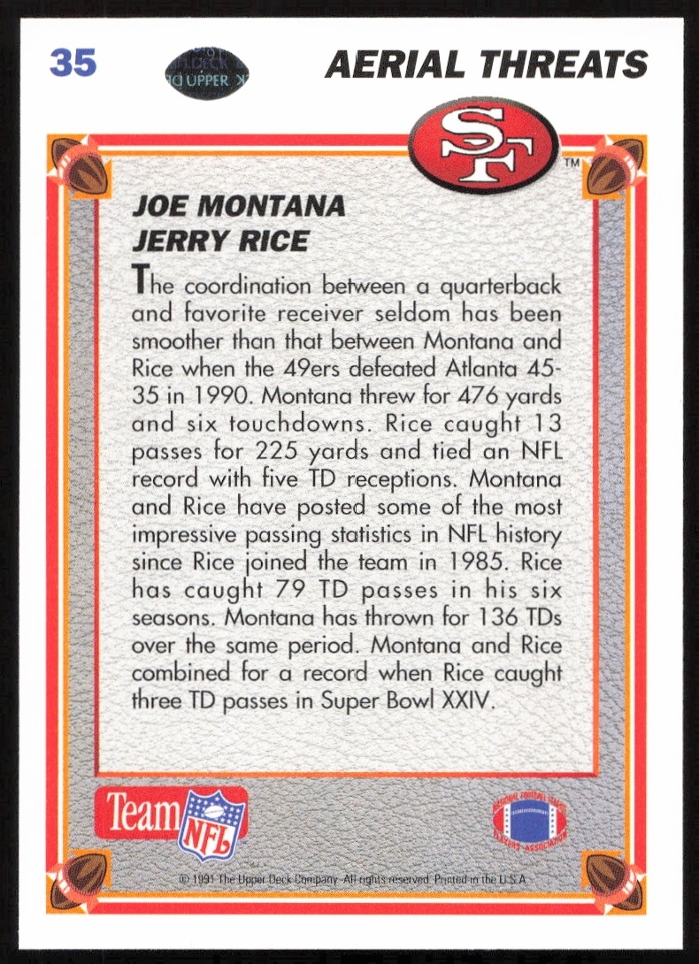 This Football card, from 1991 is part of the Upper Deck card set. Joe Montana / Jerry Rice AT is featured and has a card number of 35.