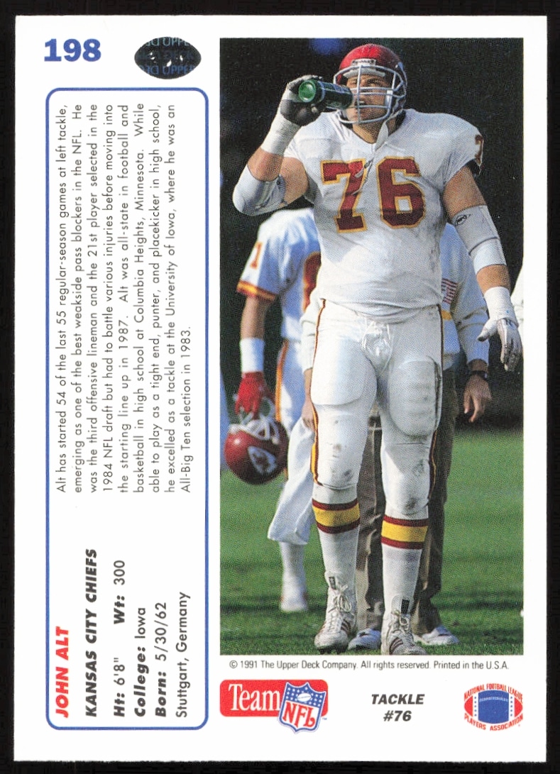 This Football card, from 1991 is part of the Upper Deck card set. John Alt is featured and has a card number of 198.