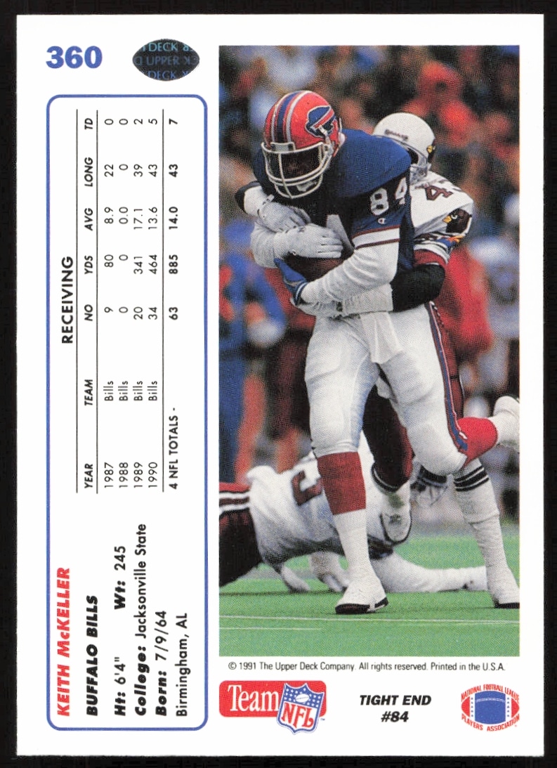 This Football card, from 1991 is part of the Upper Deck card set. Keith McKeller is featured and has a card number of 360.