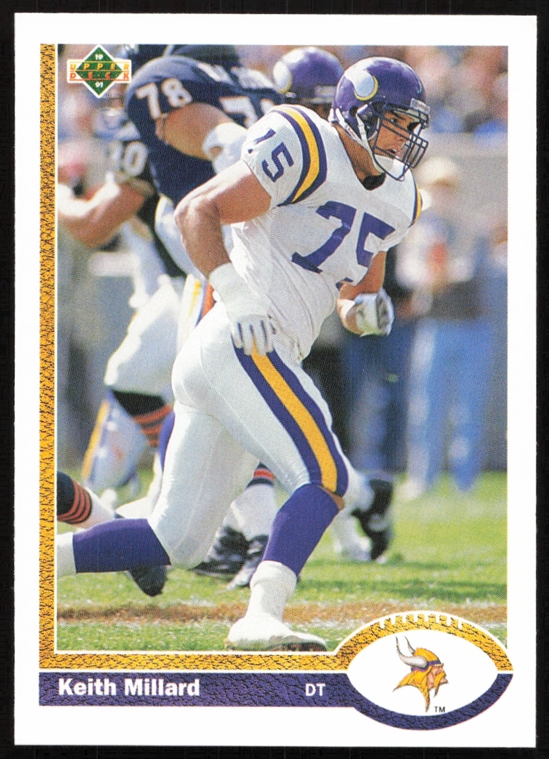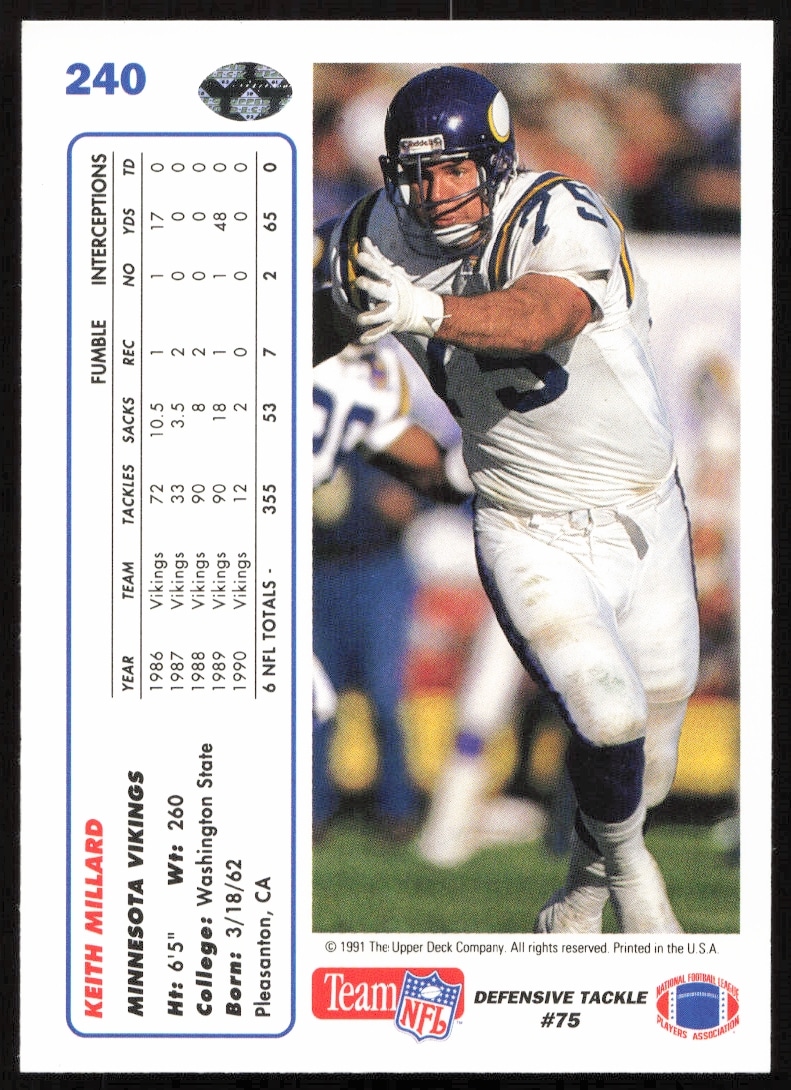 This Football card, from 1991 is part of the Upper Deck card set. Keith Millard is featured and has a card number of 240.
