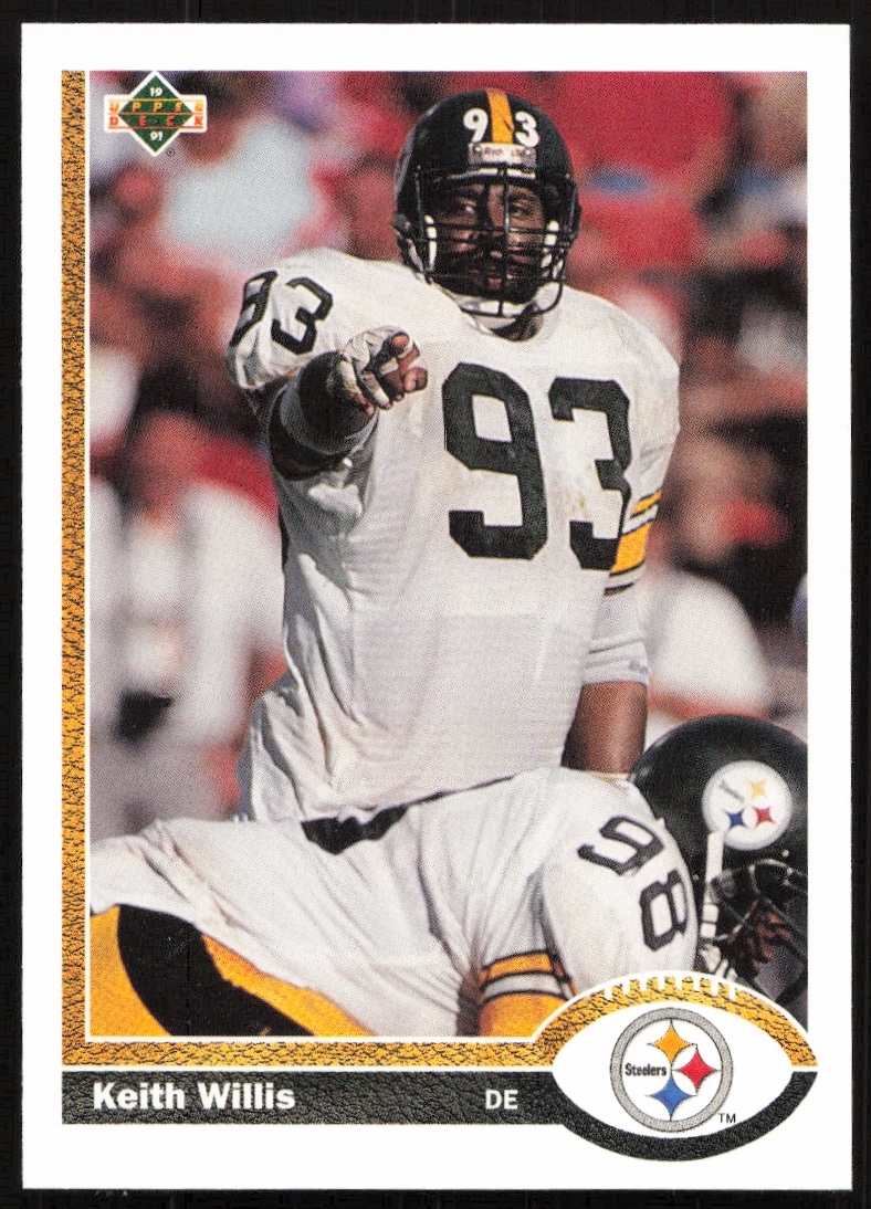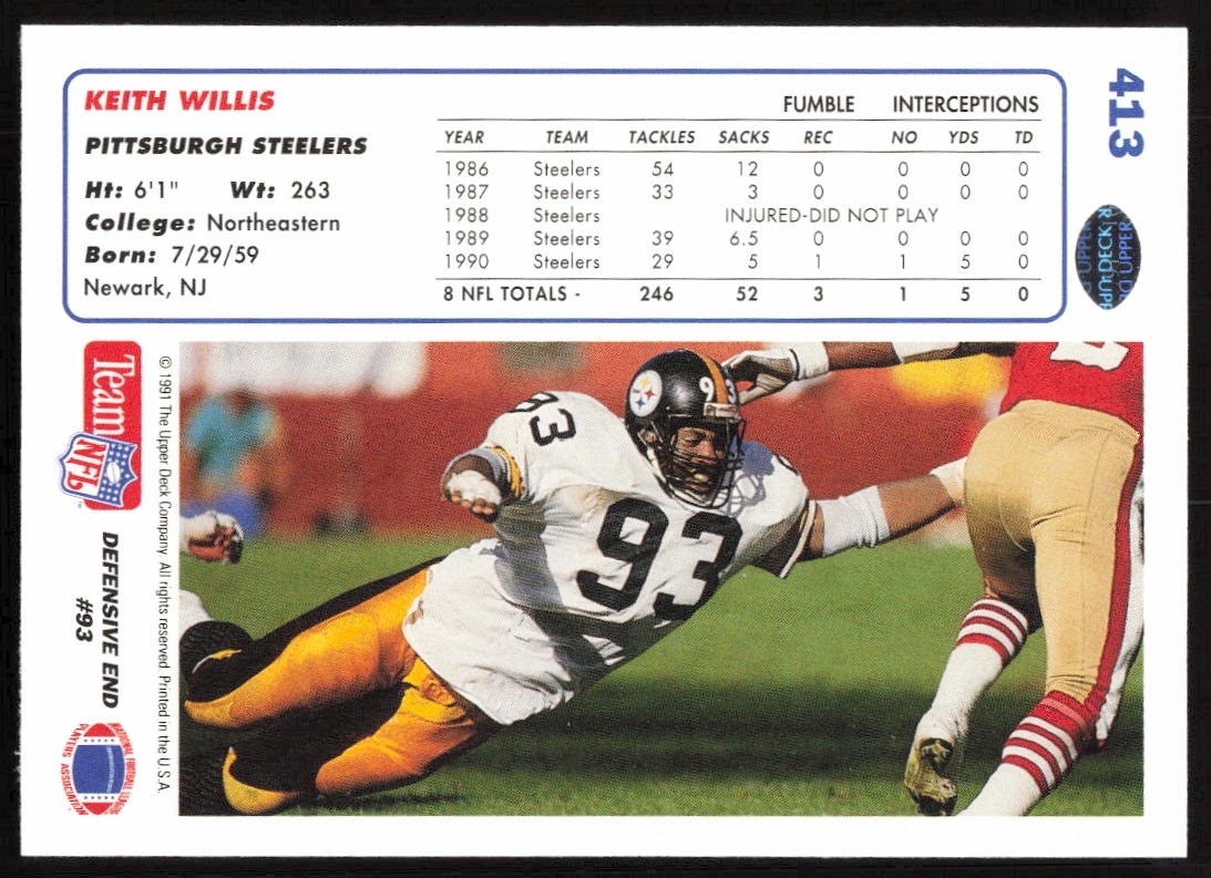 This Football card, from 1991 is part of the Upper Deck card set. Keith Willis is featured and has a card number of 413.