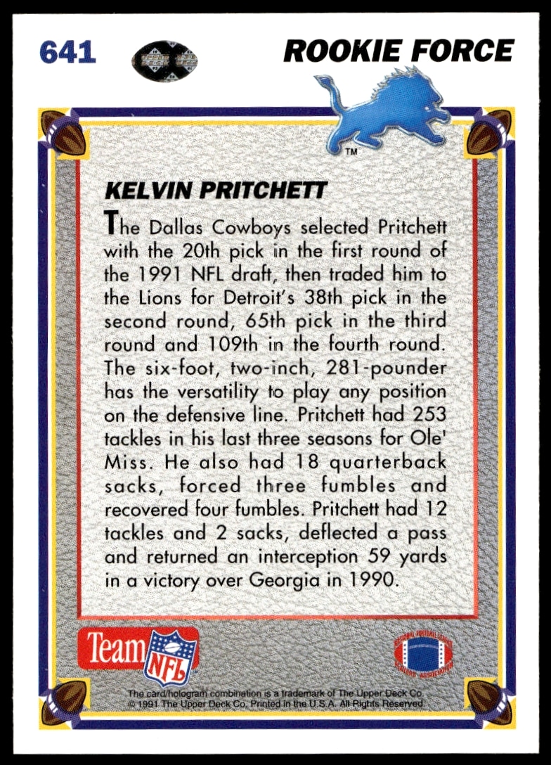This Football card, from 1991 is part of the Upper Deck card set. Kelvin Pritchett is featured and has a card number of 641.