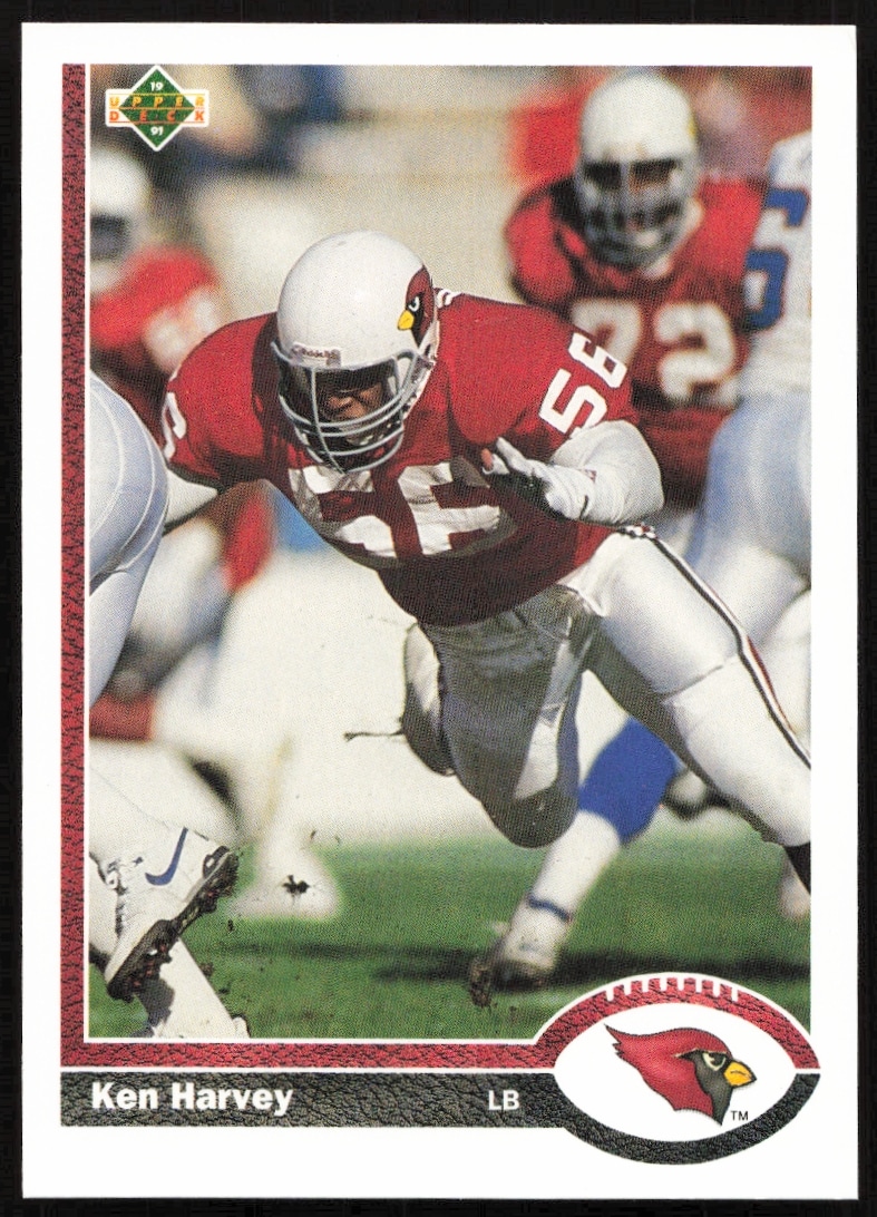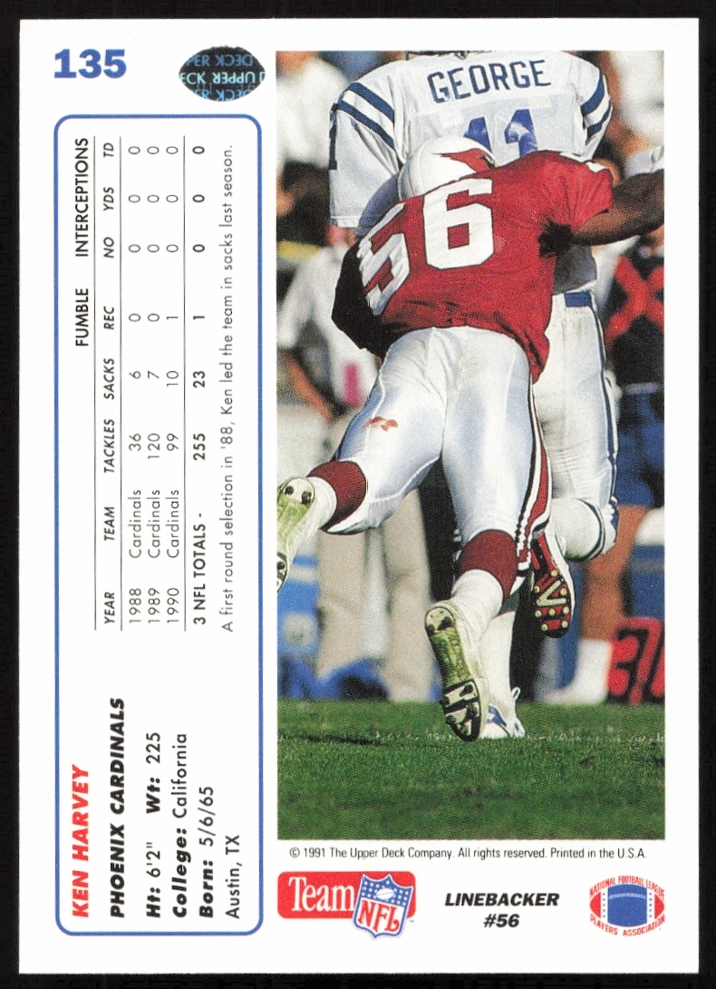 This Football card, from 1991 is part of the Upper Deck card set. Ken Harvey is featured and has a card number of 135.