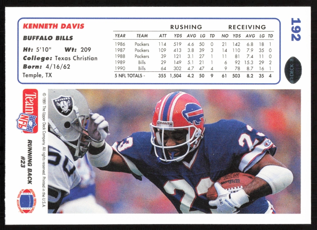 This Football card, from 1991 is part of the Upper Deck card set. Kenneth Davis is featured and has a card number of 192.