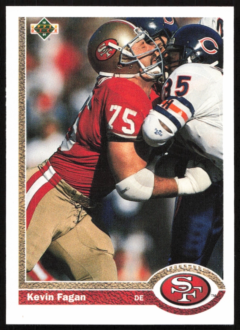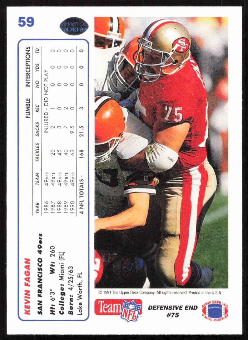 This Football card, from 1991 is part of the Upper Deck card set. Kevin Fagan is featured and has a card number of 59.