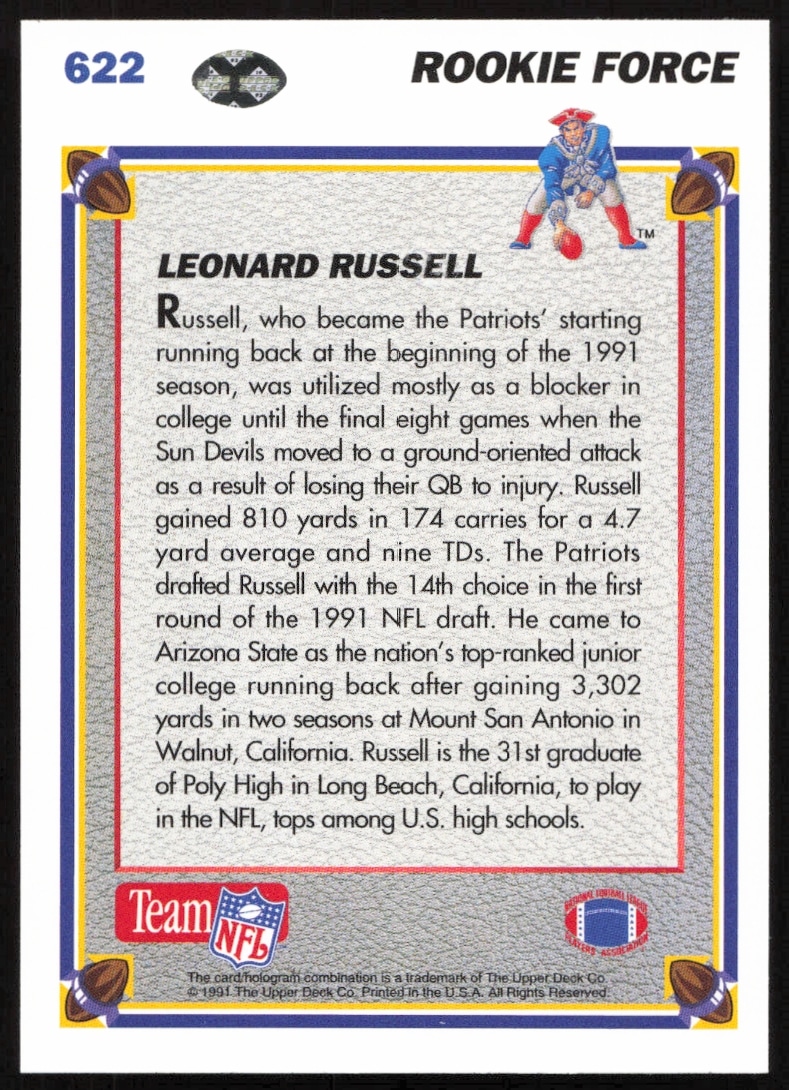 This Football card, from 1991 is part of the Upper Deck card set. Leonard Russell is featured and has a card number of 622.