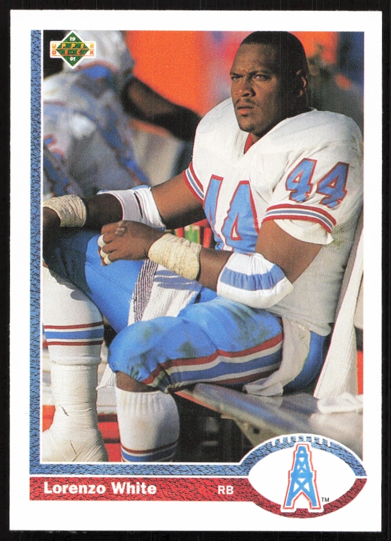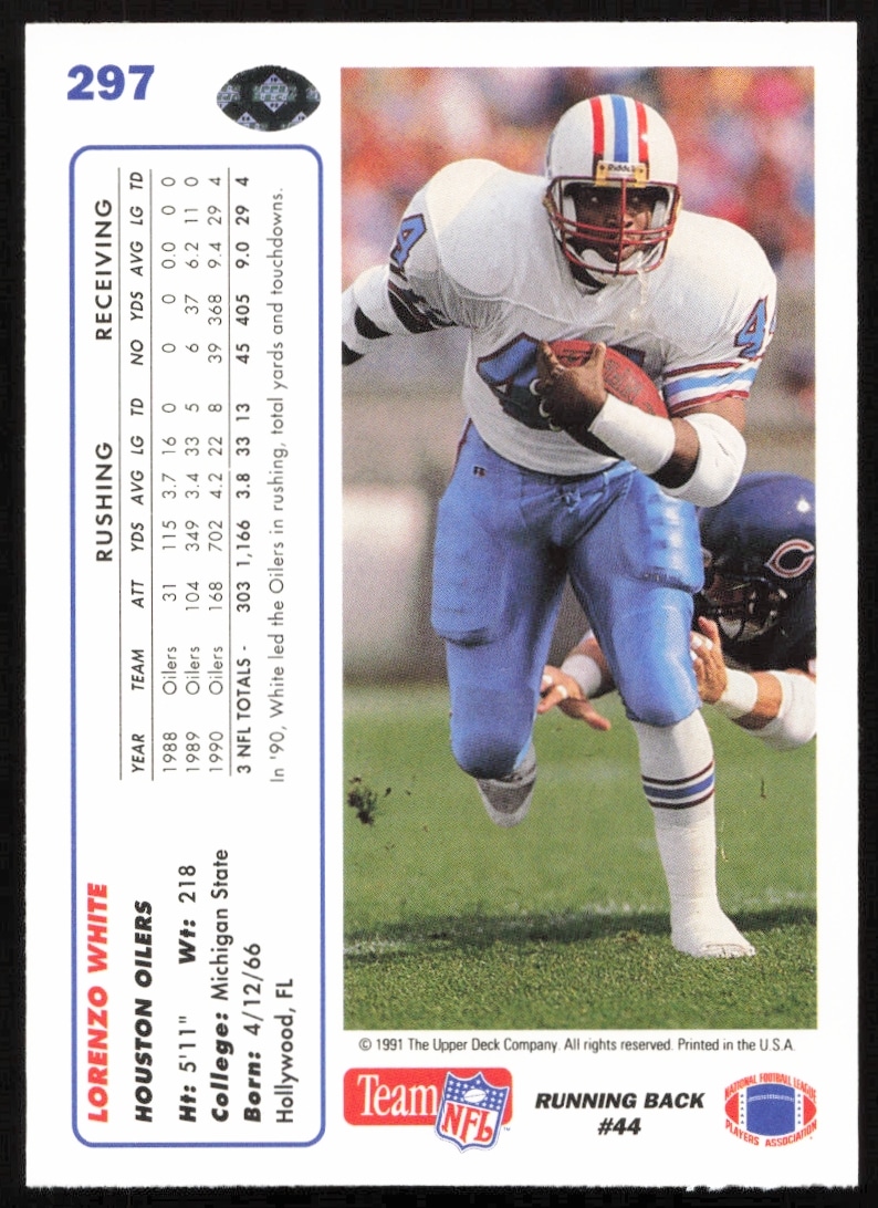 This Football card, from 1991 is part of the Upper Deck card set. Lorenzo White is featured and has a card number of 297.