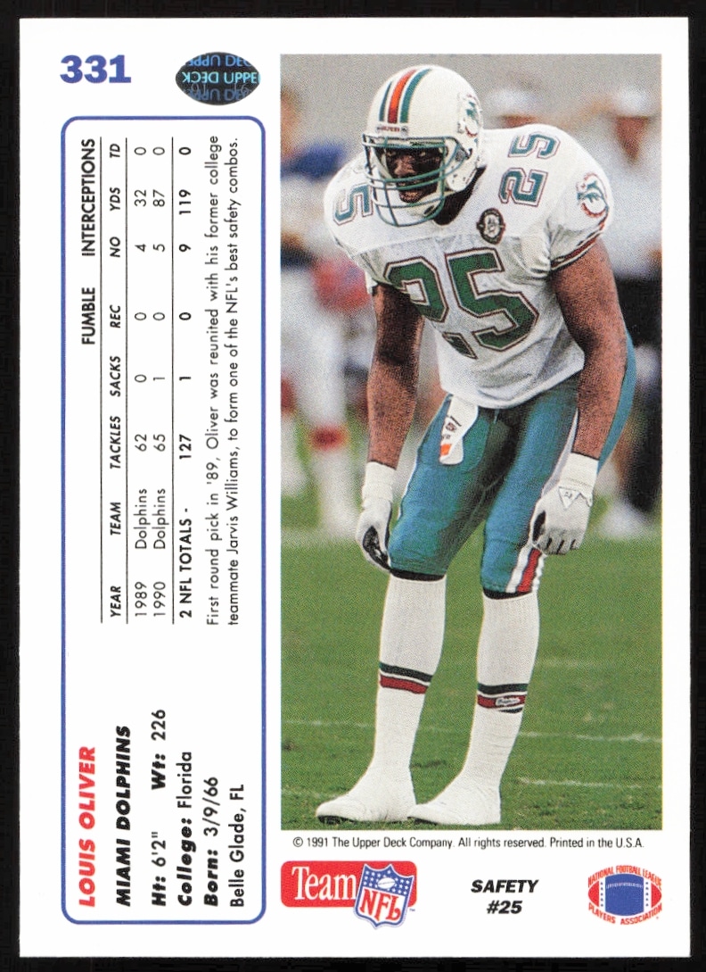 This Football card, from 1991 is part of the Upper Deck card set. Louis Oliver is featured and has a card number of 331.