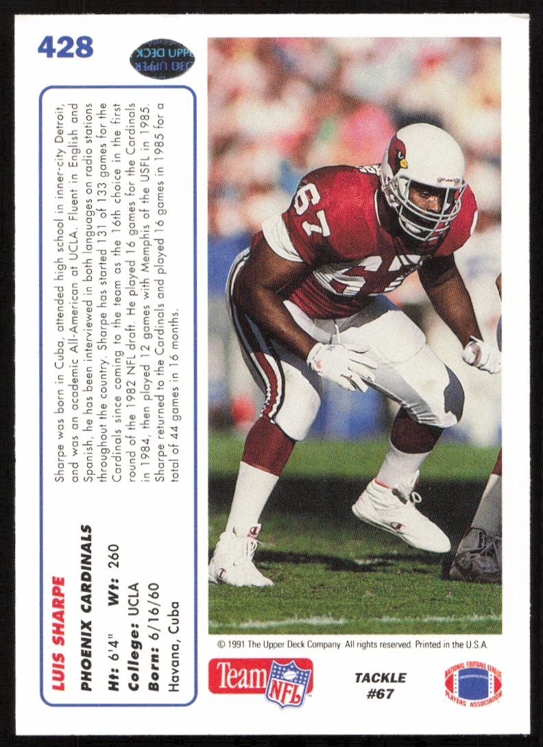 This Football card, from 1991 is part of the Upper Deck card set. Luis Sharpe is featured and has a card number of 428.