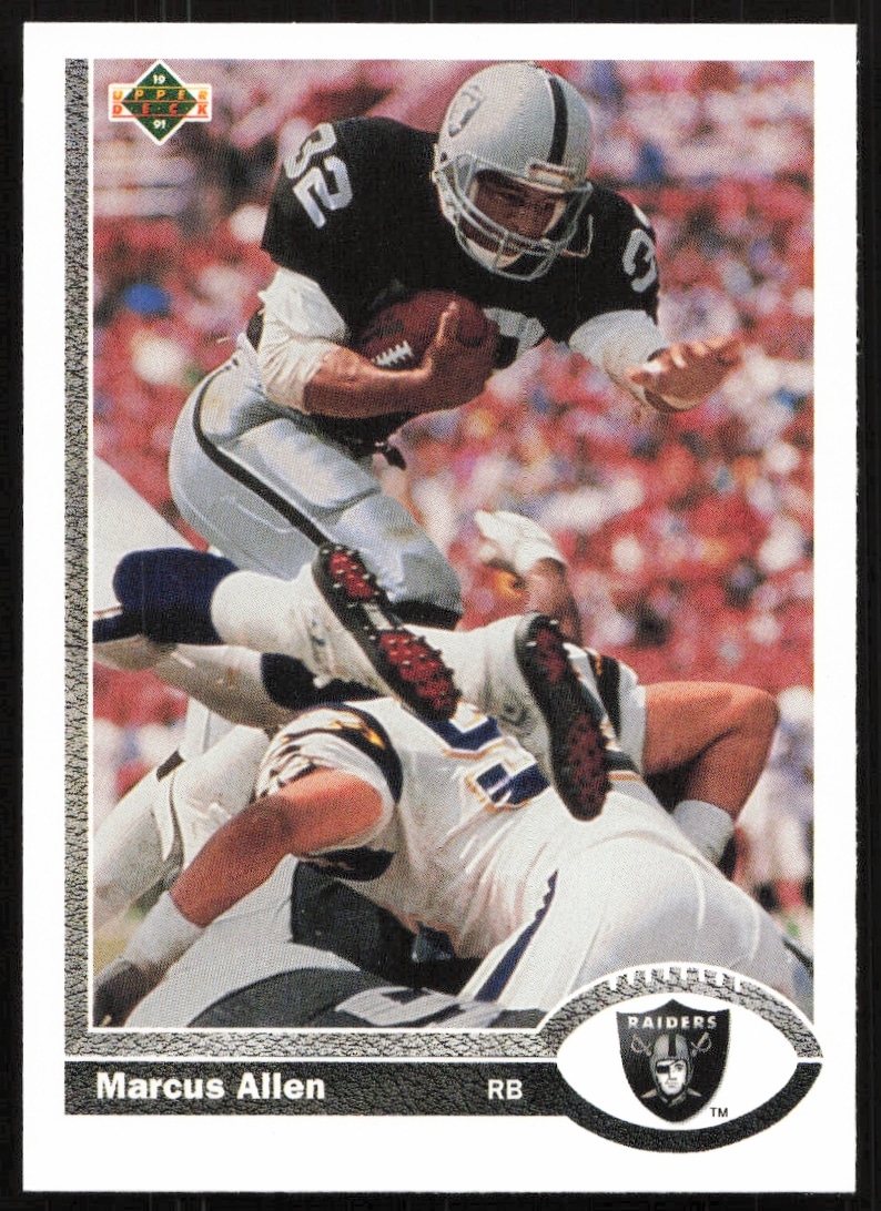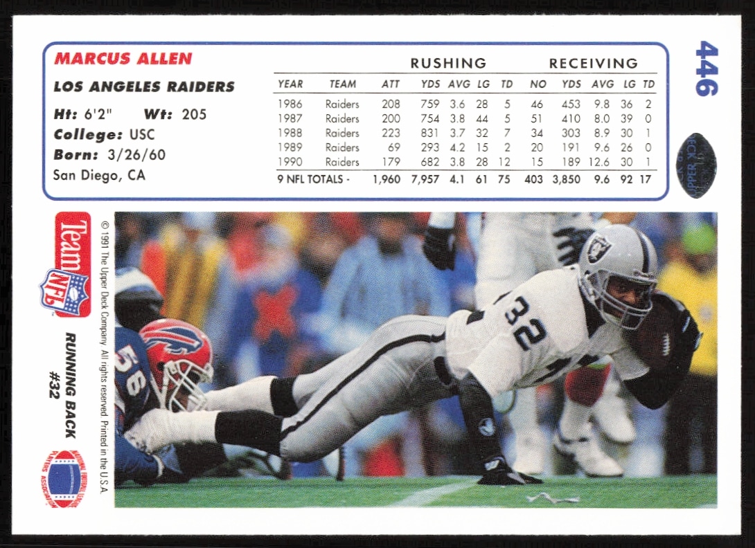 This Football card, from 1991 is part of the Upper Deck card set. Marcus Allen is featured and has a card number of 446.