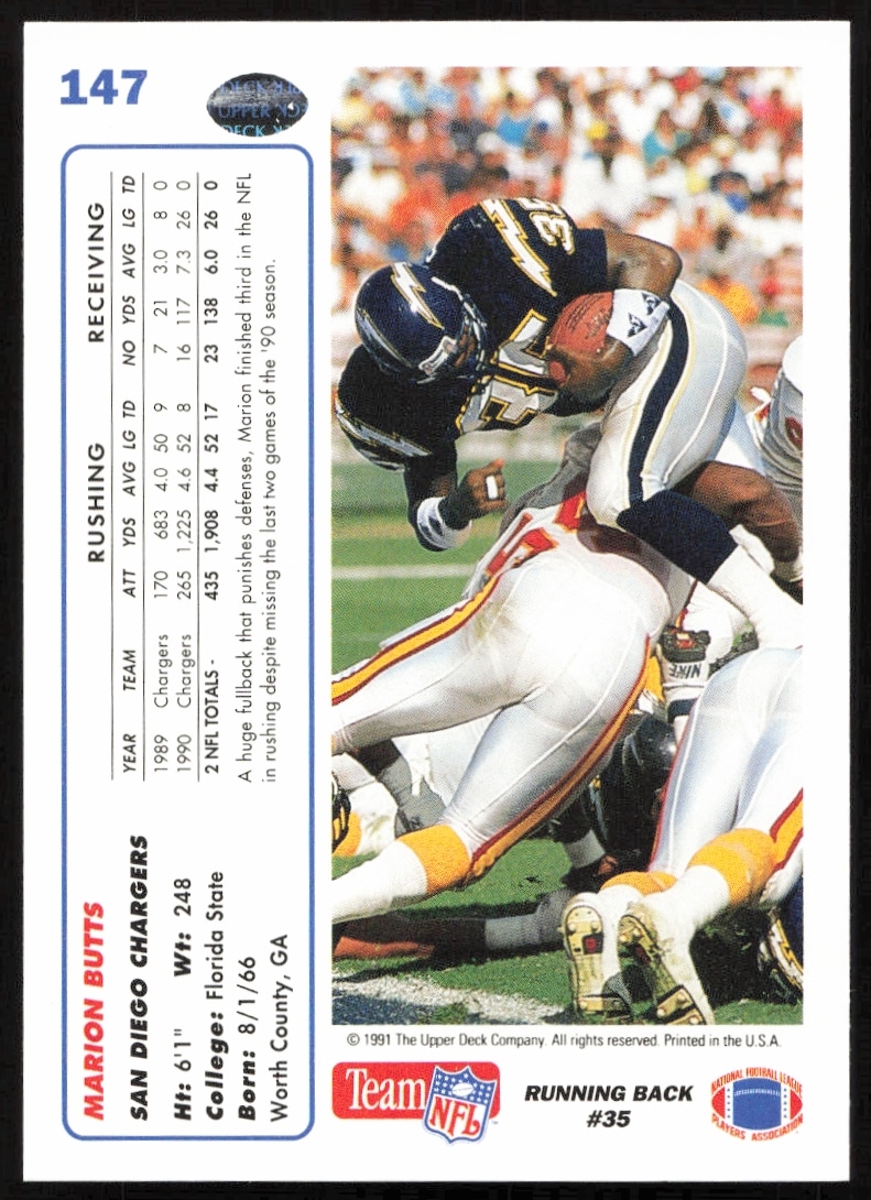 This Football card, from 1991 is part of the Upper Deck card set. Marion Butts is featured and has a card number of 147.