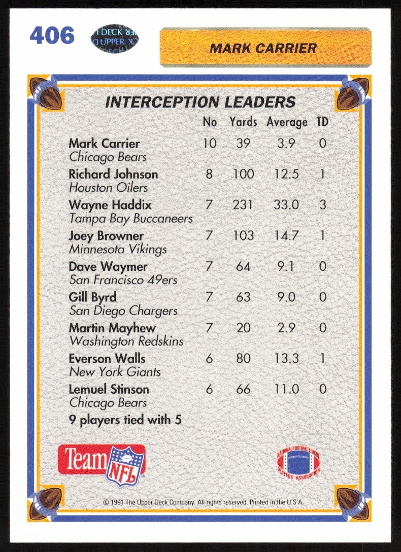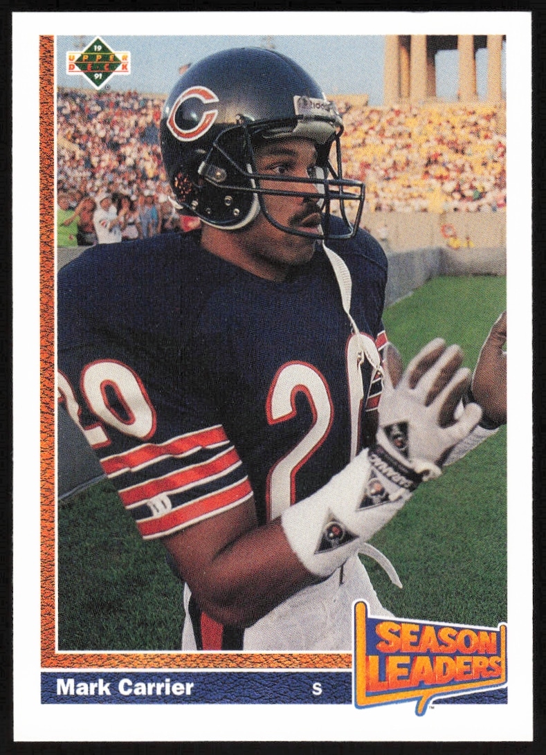 This Football card, from 1991 is part of the Upper Deck card set. Mark Carrier is featured and has a card number of 406.