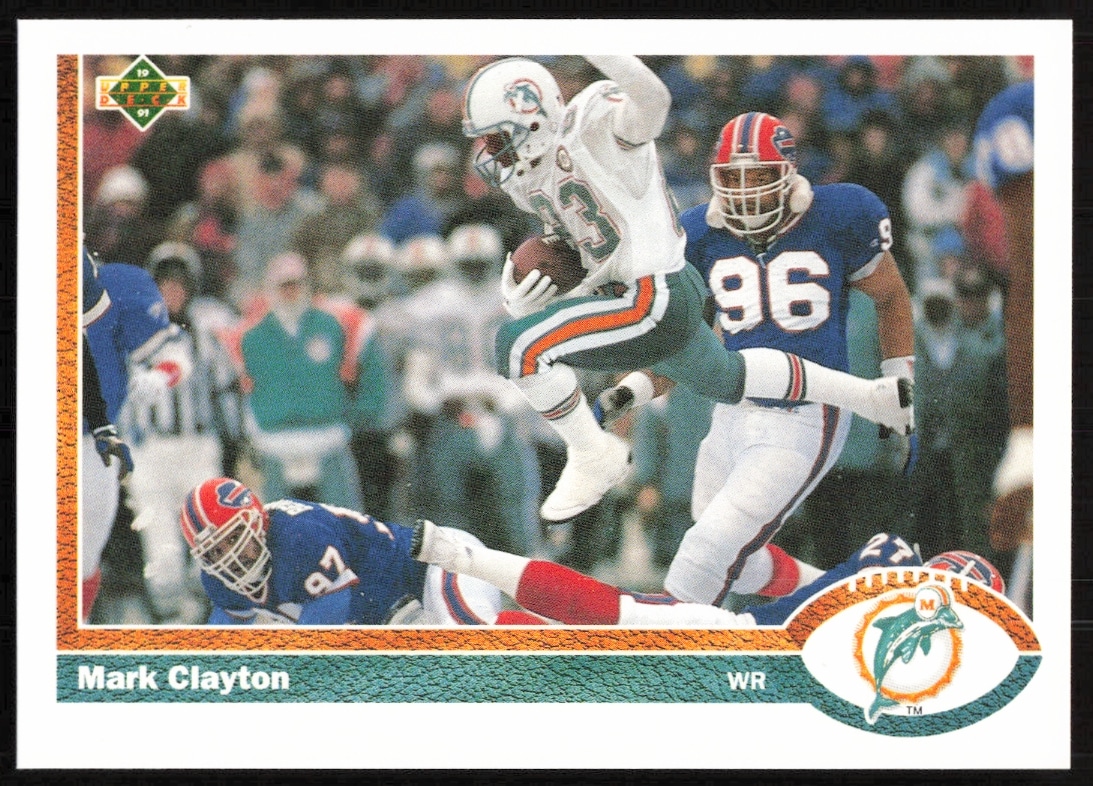 This Football card, from 1991 is part of the Upper Deck card set. Mark Clayton is featured and has a card number of 175.