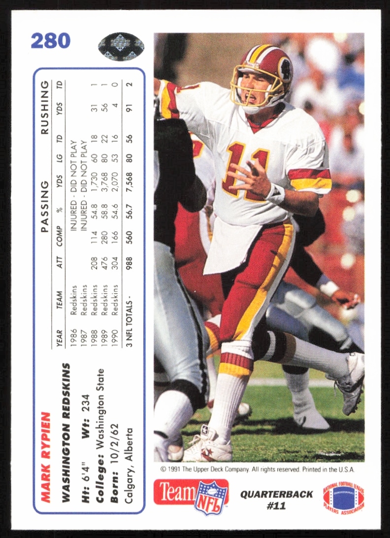 This Football card, from 1991 is part of the Upper Deck card set. Mark Rypien is featured and has a card number of 280.