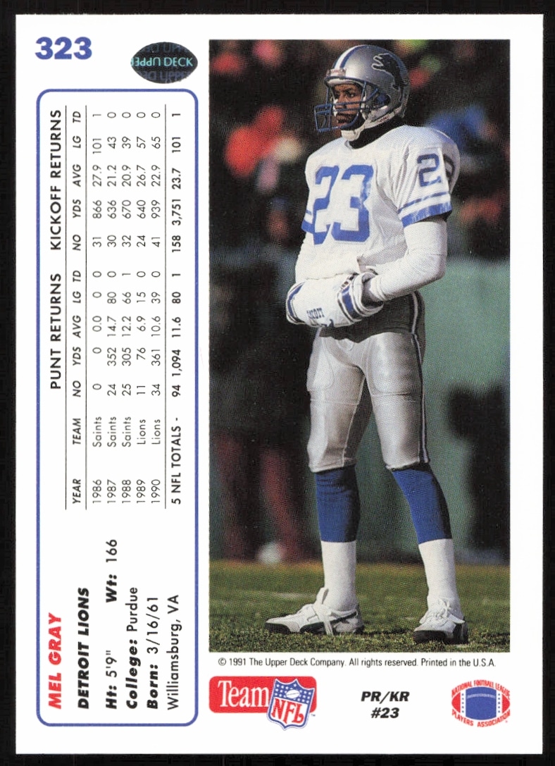 This Football card, from 1991 is part of the Upper Deck card set. Mel Gray is featured and has a card number of 323.