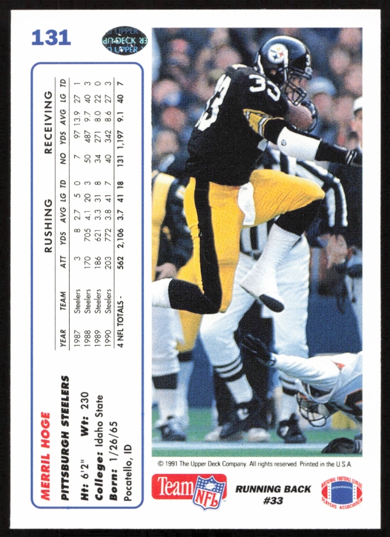 This Football card, from 1991 is part of the Upper Deck card set. Merril Hoge is featured and has a card number of 131.