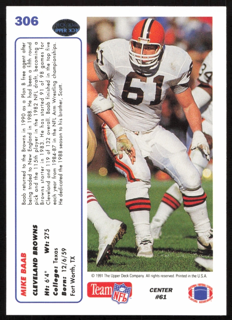 This Football card, from 1991 is part of the Upper Deck card set. Mike Baab is featured and has a card number of 306.
