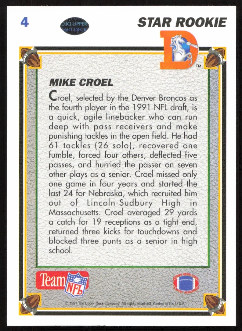 This Football card, from 1991 is part of the Upper Deck card set. Mike Croel is featured and has a card number of 4.
