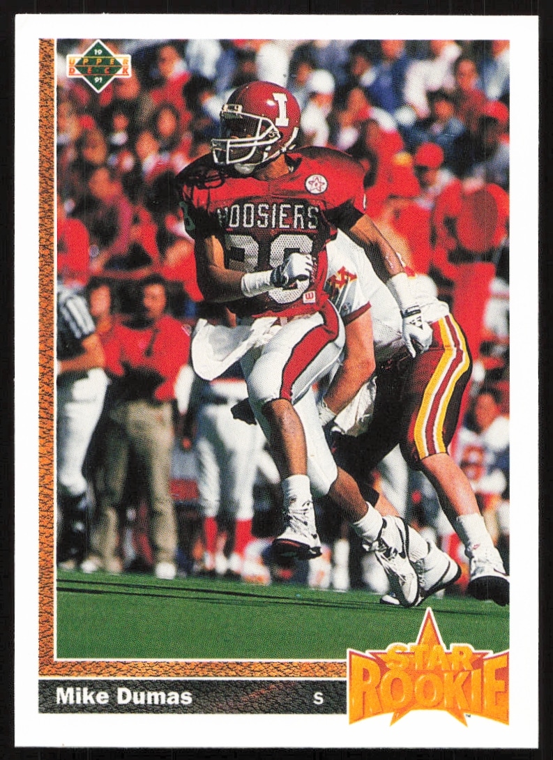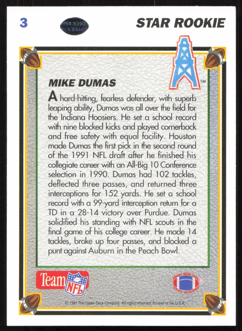 This Football card, from 1991 is part of the Upper Deck card set. Mike Dumas is featured and has a card number of 3.
