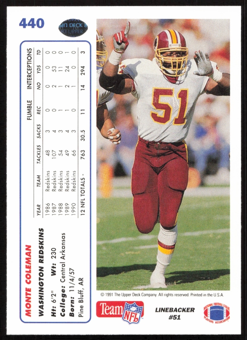 This Football card, from 1991 is part of the Upper Deck card set. Monte Coleman is featured and has a card number of 440.